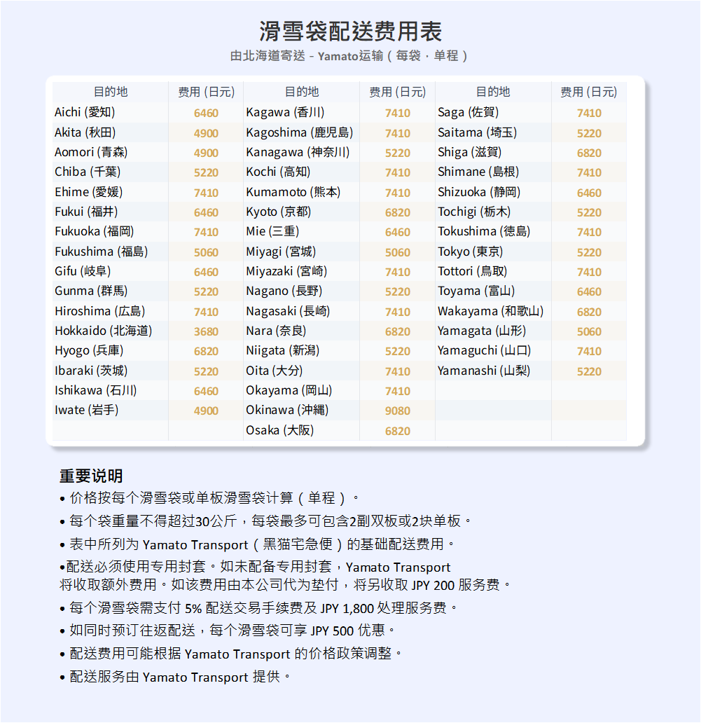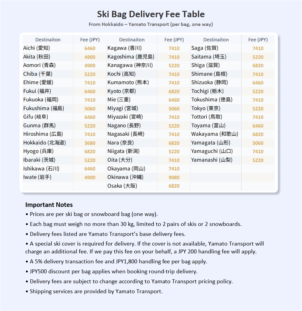 We deliver through YAMATO Transport to any Ski Resorts / Hotels / Airbnbs in Japan.